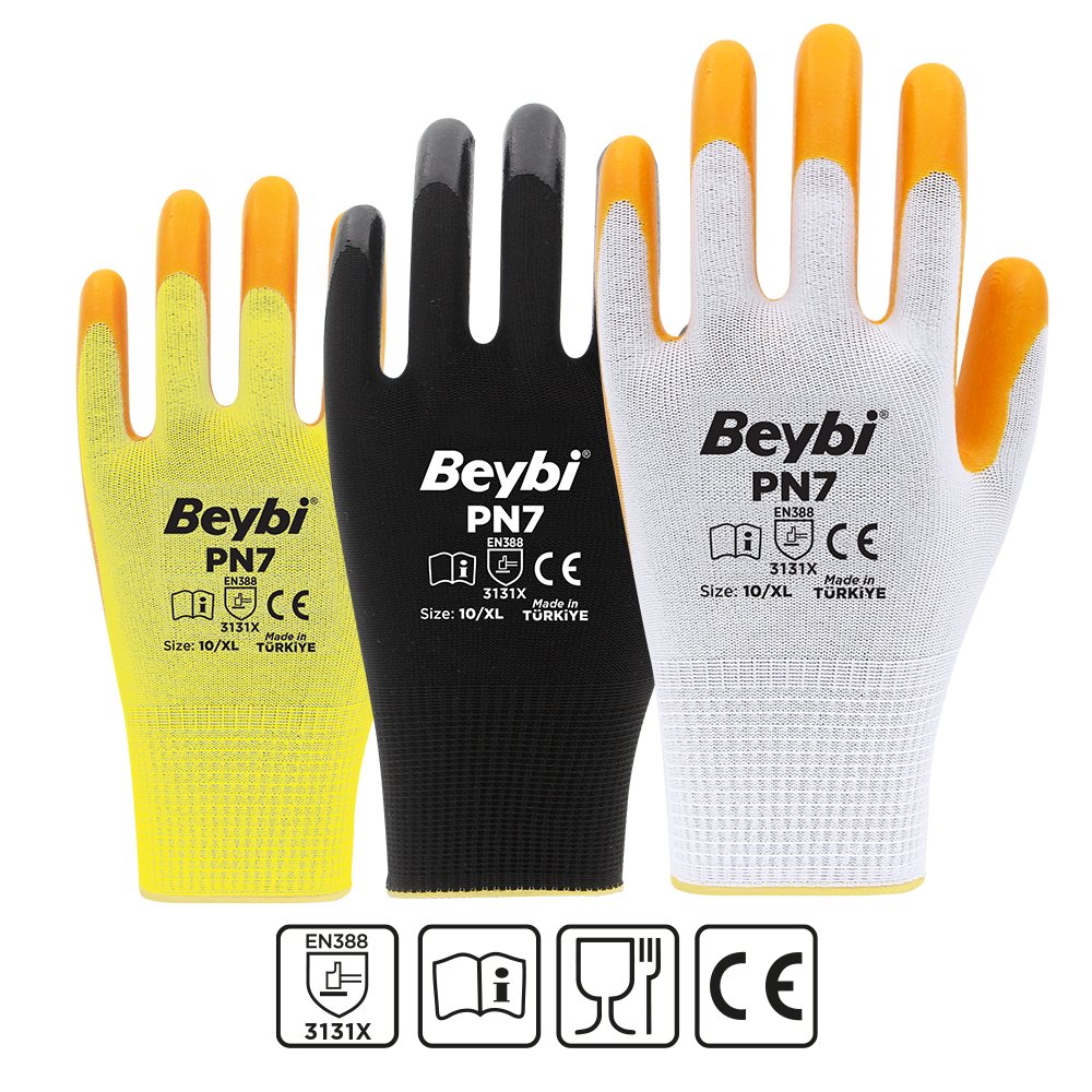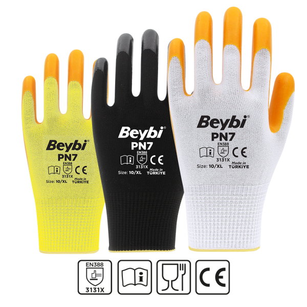 PN7 eldivenler ince ve hafif olması sayesinde üstün el becerisi ve konfor sağlar. Polyester örgü yapısı elinizin hava almasını sağlar, terletme yapmaz. Esnek konç yapısı bileğinize tam uyum sağlar. Aşınma ve yırtılmaya karşı uzun süre dayanıklıdır. Gıda İle temasa uygundur. REACH uyumludur.