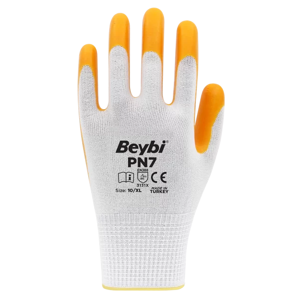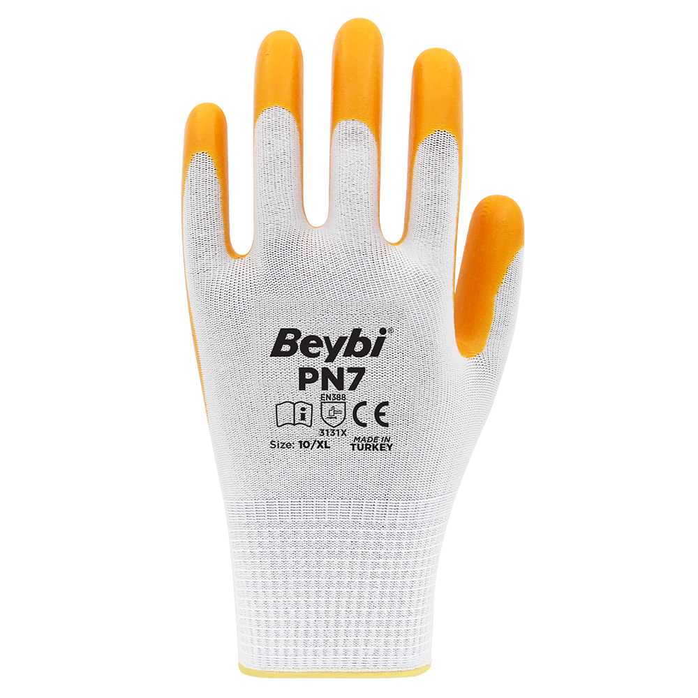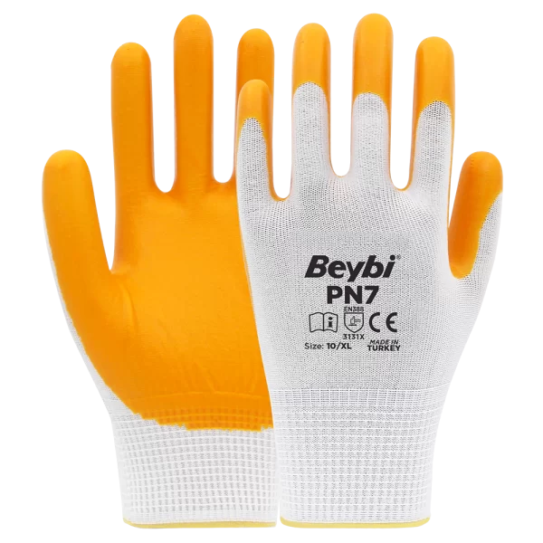 PN7 Polyester Örme Nitril Eldiven, çok yönlü kullanımı ve sağladığı koruma ile inşaat, bahçe, tarım, üretim, imalat ve iş güvenliği sektörlerinde tercih edilen bir eldiven çeşididir. Bu eldivenler, dayanıklı bir polyester örgü malzemeden üretilmiştir ve nitril kaplamaya sahiptir.
